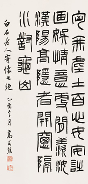 高式熊,1921年生,浙江鄞县人。现为中国书协会员、西泠印社名誉副社长、上海市书协顾问、上海市文史研究馆馆员。其父高振霄乃晚清翰林太史、新中国上海市第一批文史研究馆馆员、著名书法家。他幼承家学,书法得到父亲亲授,20岁时获海上名家赵叔孺、王福庵指导,擅书法、篆刻及印学鉴定,书法出规入矩,端雅大方;后又喜摹印作,对历代印谱、印人流派极有研究。其书法楷、行、篆、隶兼擅,清逸洒脱,尤以小篆最为精妙,与篆刻并...(详细介绍)